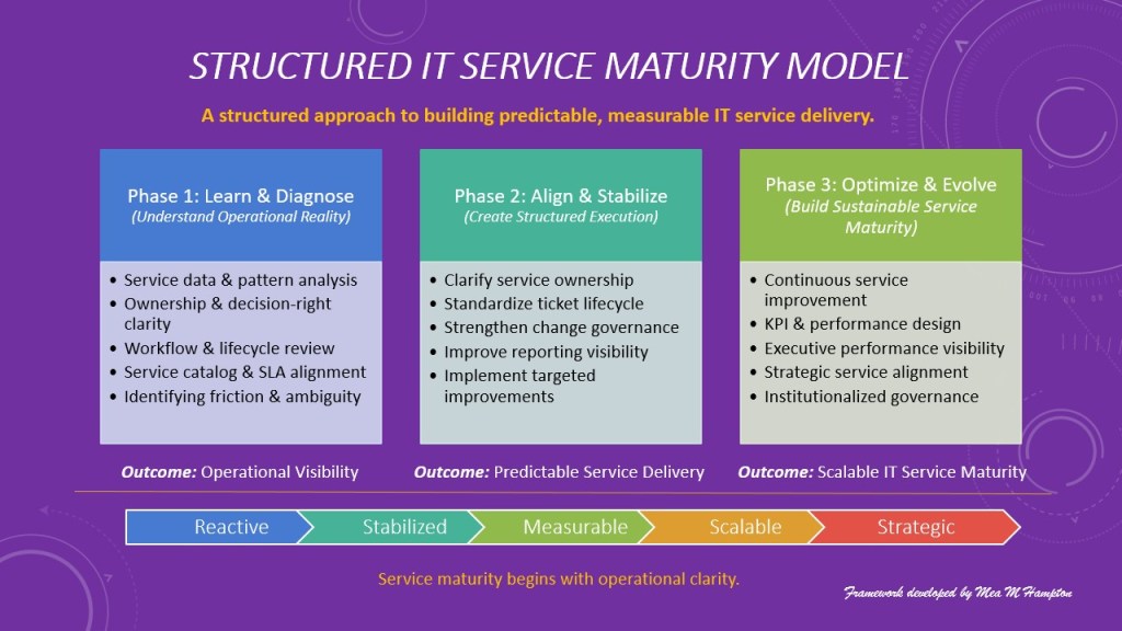 This framework ensures that service maturity evolves intentionally, allowing teams to reduce friction, strengthen accountability, and build sustainable service performance. The result is an IT organization that is not only operationally effective but also strategically aligned with the enterprise’s goals.